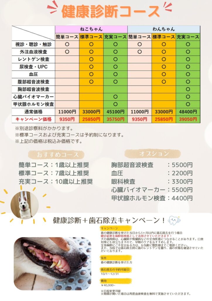 条件 | 春の健康診断を受けた方 術前検査費用が無料、あるいは割引となります。 |